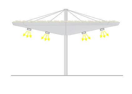 Ausstattung integriertes Lichtkonzept, feuerverzinkte Stahlstruktur pulverbeschichtet in individueller Farbe