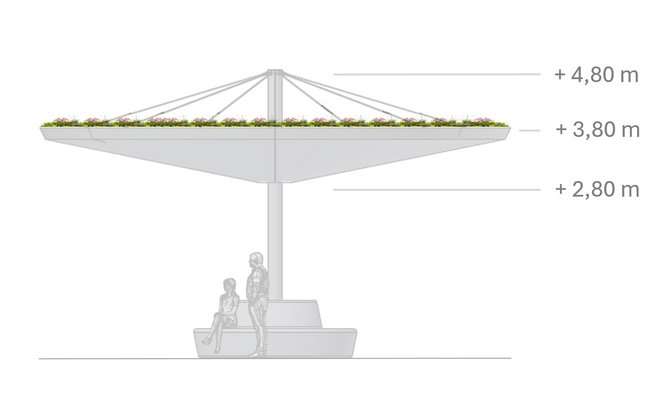 Im Gegensatz zu klassischen Großschirmen oder Membranlösungen ist URBAN Shade dauerhaft statt temporär, natürlich statt künstlich und wartungsfrei statt pflegeintensiv. Es verbindet Design, Klimaschutz und Nachhaltigkeit und bietet mehr als nur Schatten.
