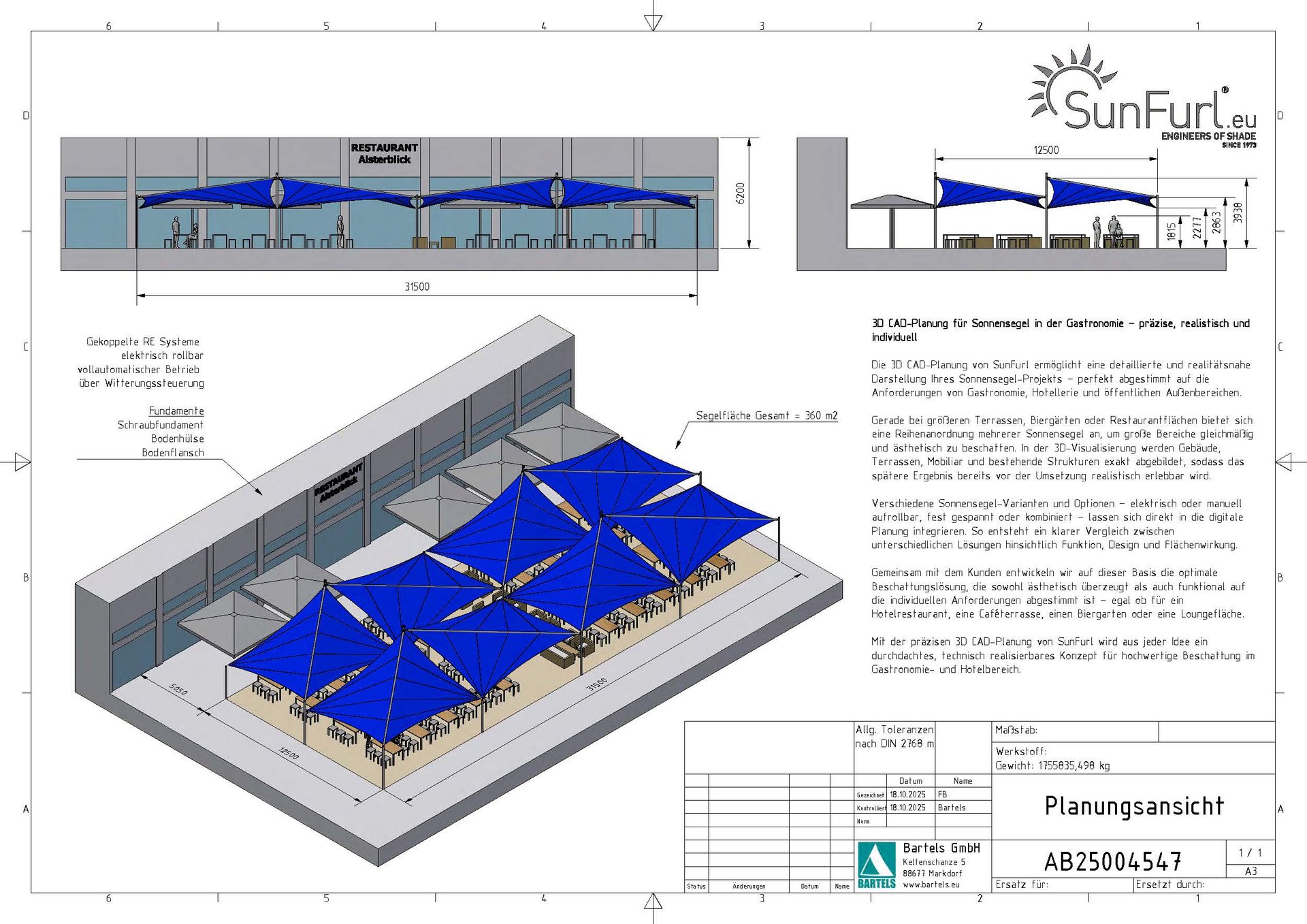 Mit der präzisen 3D CAD-Planung von SunFurl wird aus jeder Idee ein durchdachtes, technisch realisierbares Konzept für hochwertige Beschattung im Gastronomie- und Hotelbereich.